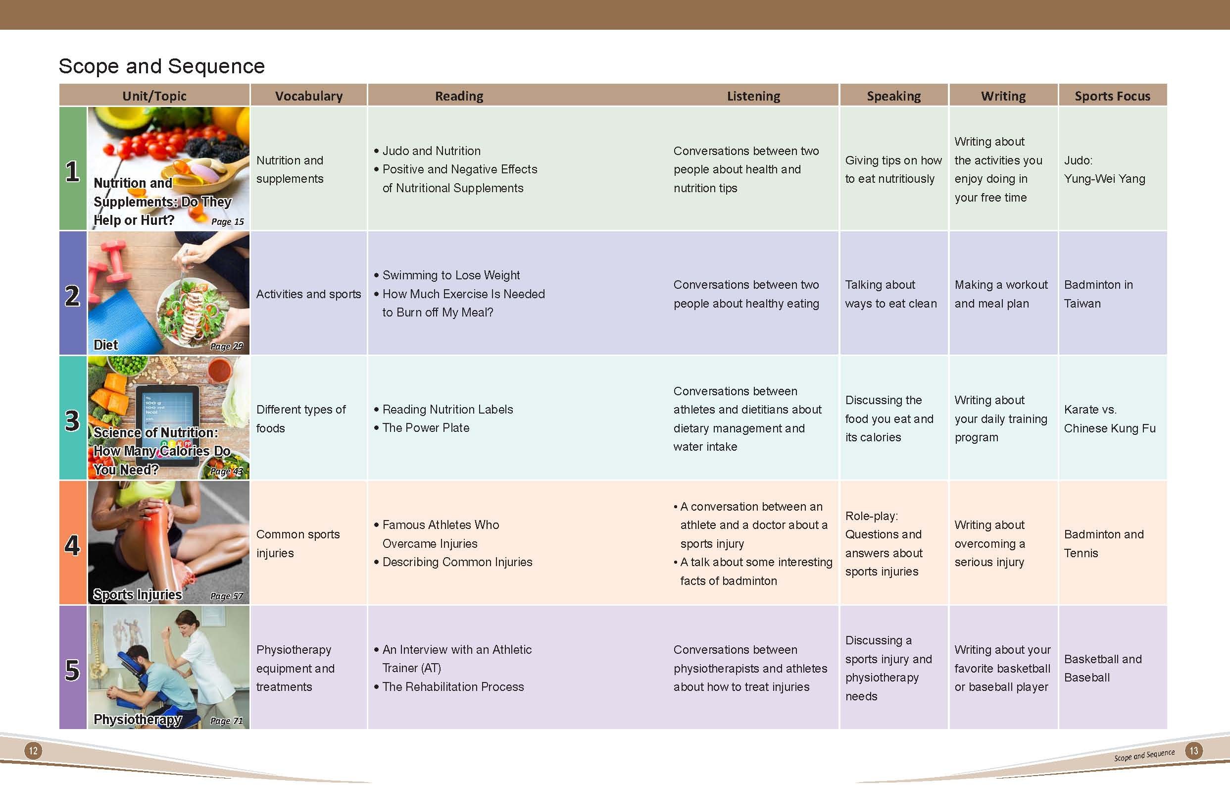 - Sports Focus in every unit features specific sports such as golf, taekwondo, gymnastics, weightlifting, track and field, ball games, etc., which are popular sports in both the Asian and Olympic Games.