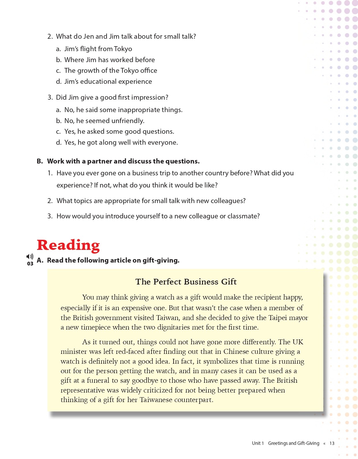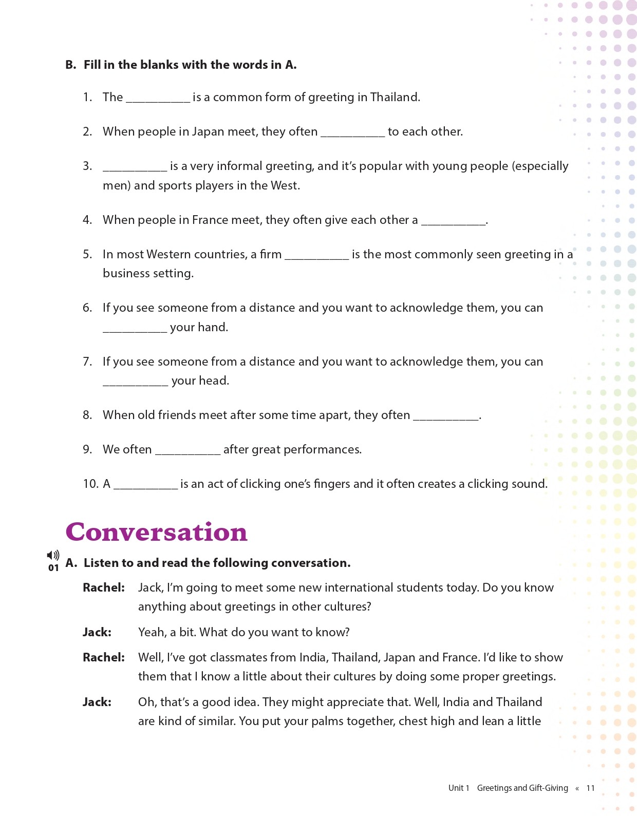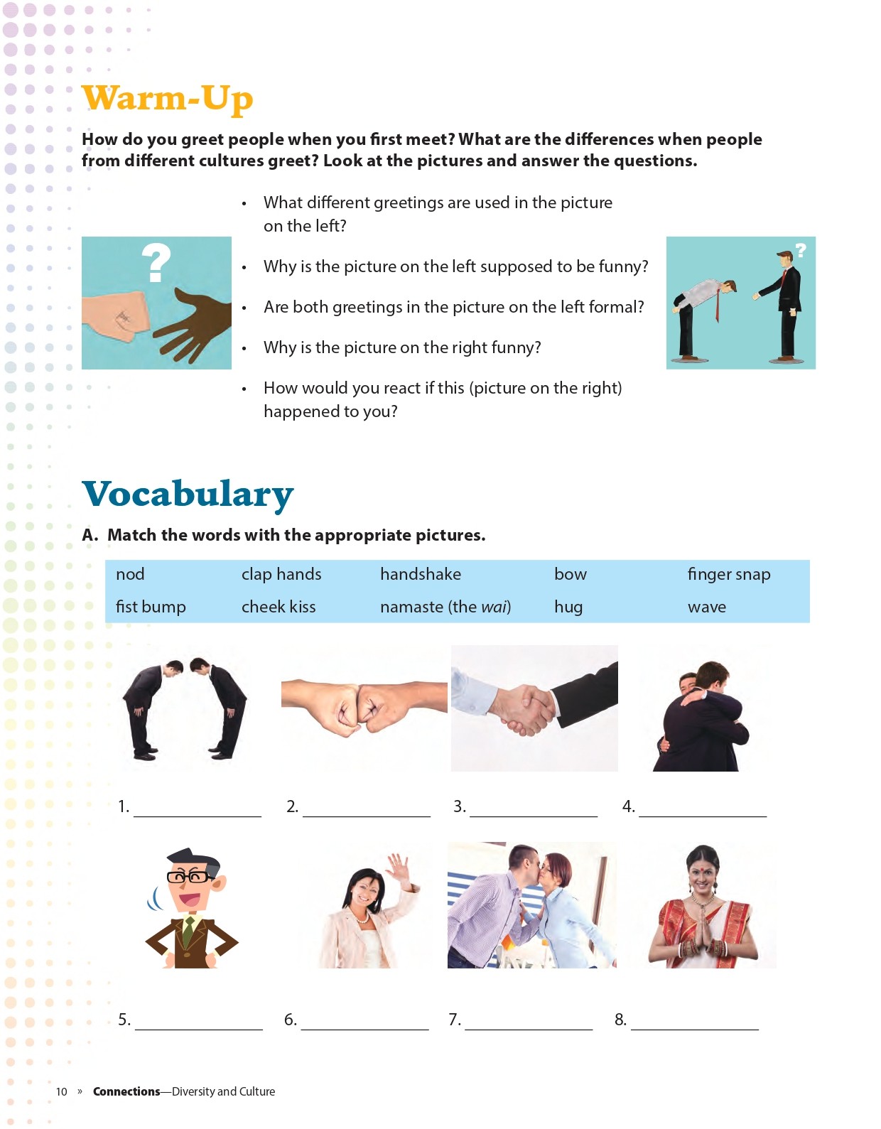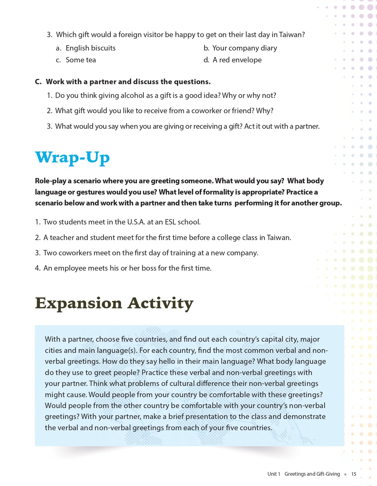 - Warm-up: These exercises begin to bring learners with the context of each unit.
