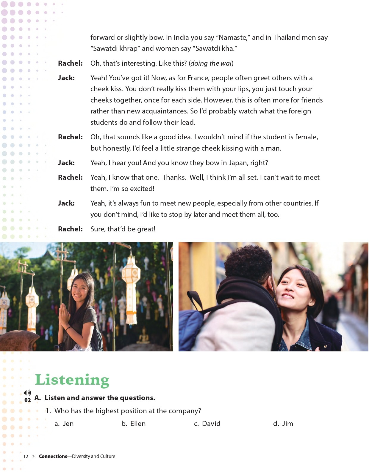 PrefaceEffective communication in today’s interconnected world requires attending to the wide variety of cultural perspectives that are found all around us. By becoming sensitive to how people from different cultures see things, we are more likely to avoid misunderstandings and to better appreciate what makes us similar to and different from one another. The purpose of this textbook is to help language learners investigate and discuss cultural issues, and to develop a heightened awareness of the role that culture plays in daily life.