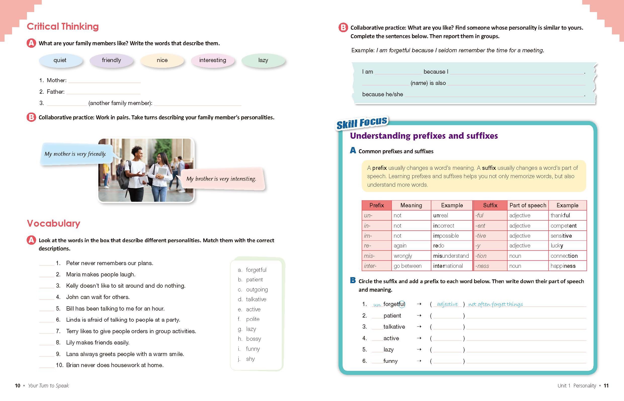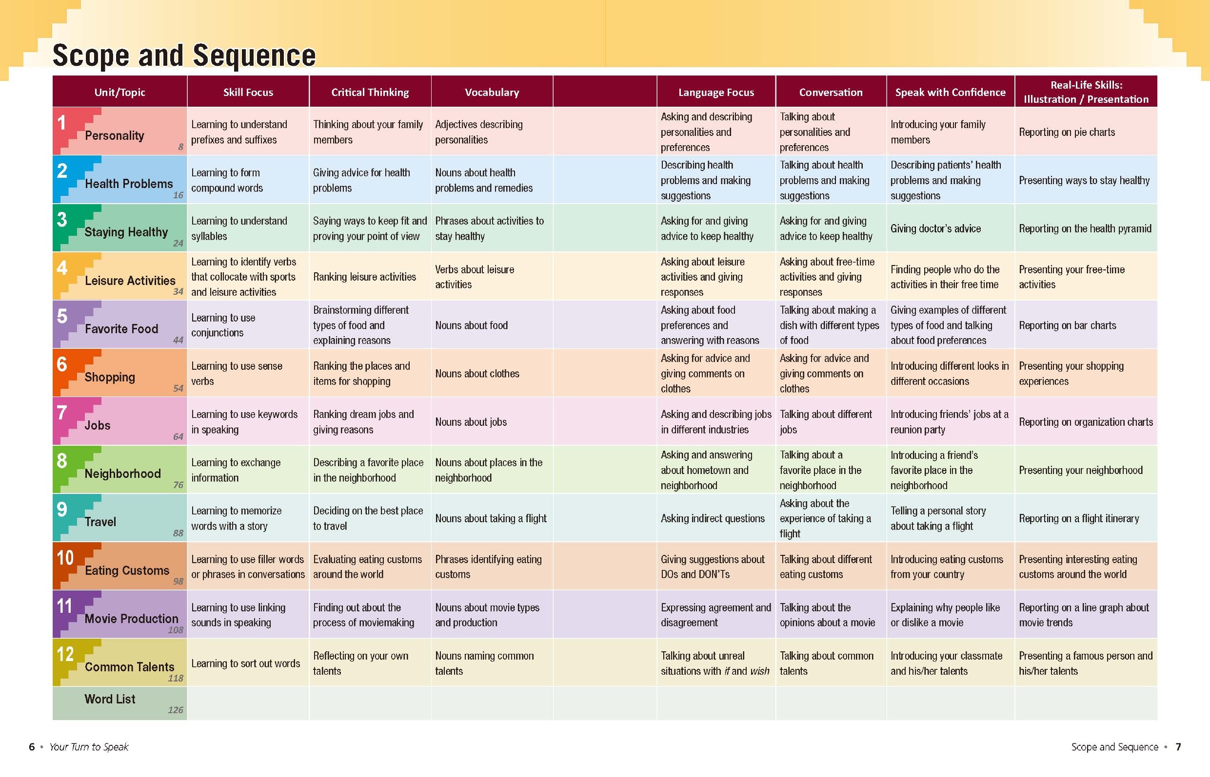 Your Turn to Speak is competence-oriented and organized spirally, from easy to more challenging practices wherein vocabulary words and sentence patterns are recycled. In each of the 12 units, learners will develop learning skills, think critically, learn vocabulary and sentence patterns collaboratively, duplicate conversations, speak with confidence, and master real-life skills. Here is what each unit contains: