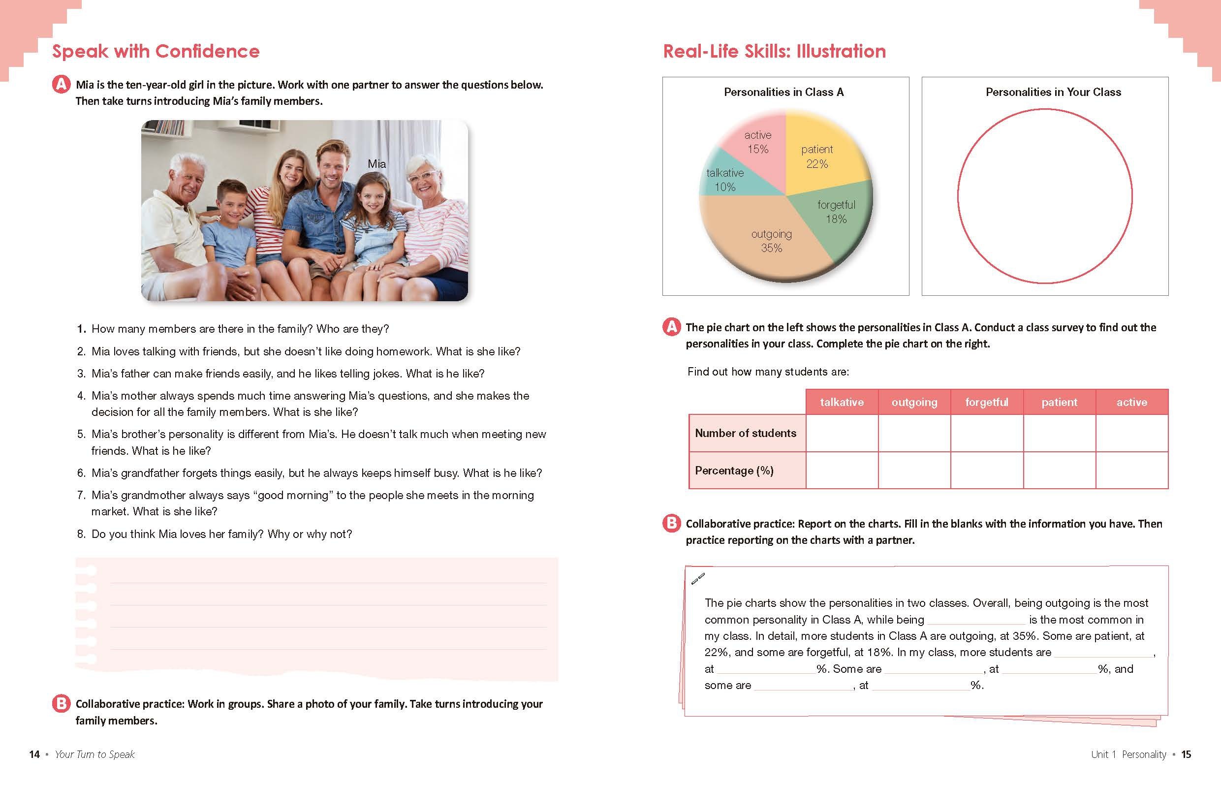 - Real-life skills – In order for learners to shine on the stage, each unit wraps up with an illustration practice where learners report charts, graphs, or pyramids, or a presentation practice where learners prepare to give a presentation about their life experiences.