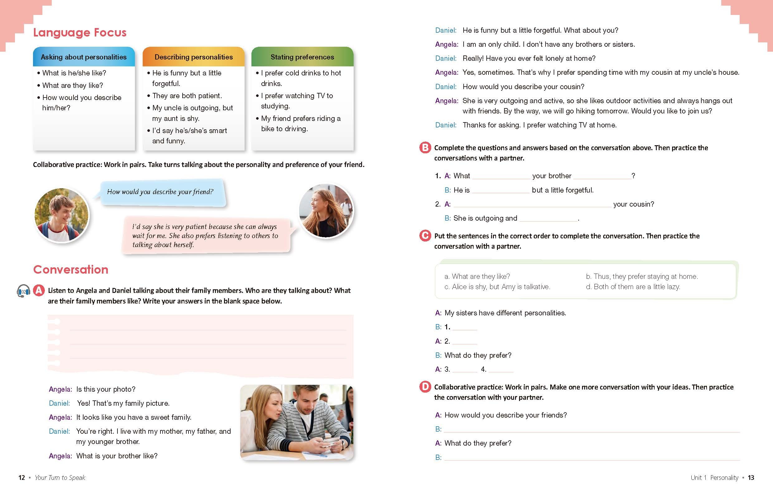 - Language focus – Each unit summarizes the sentence patterns that functionally achieve oral communication purposes, such as showing personal preferences and asking for advice, and are applied in conversations, illustrations, or presentations.
