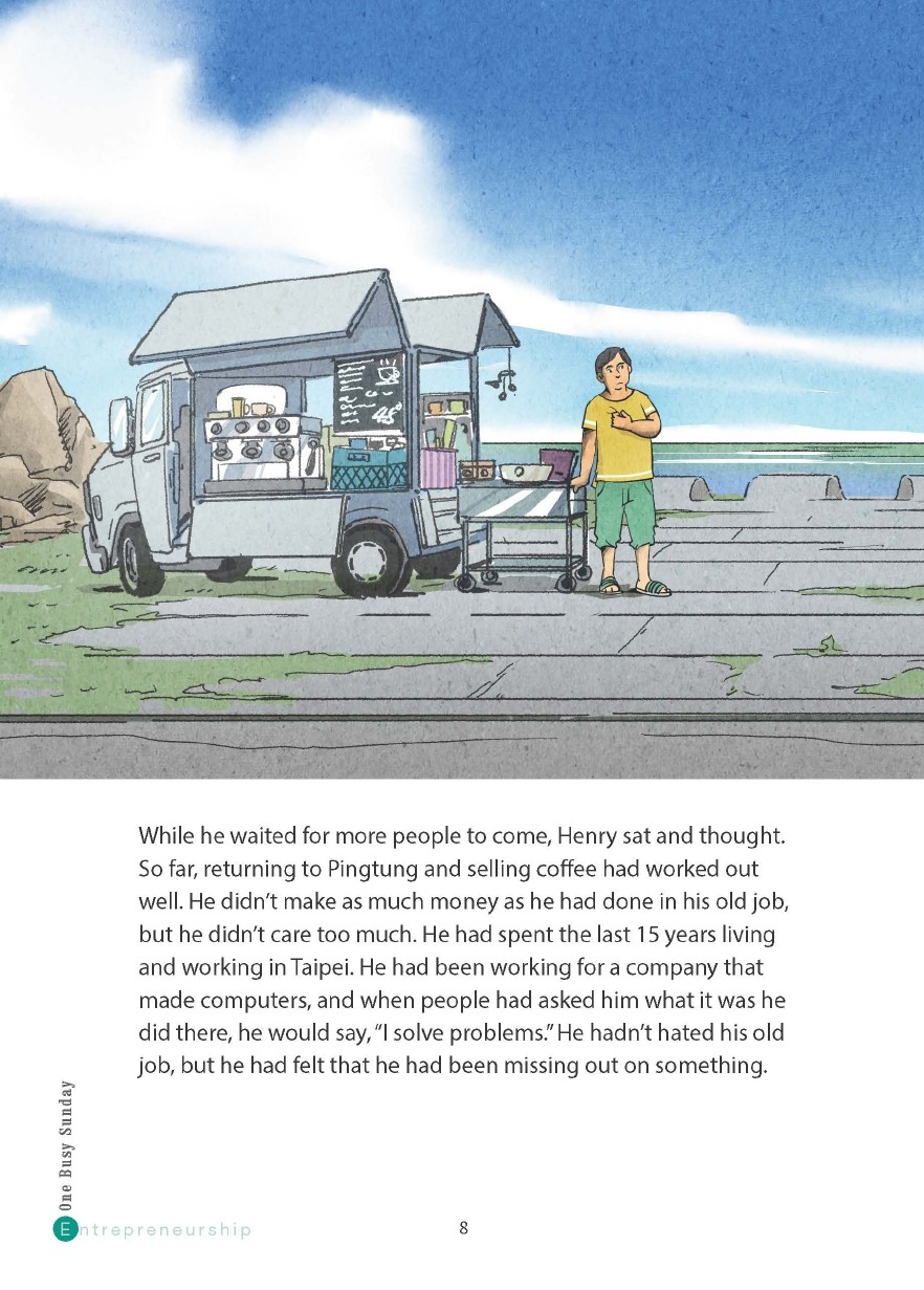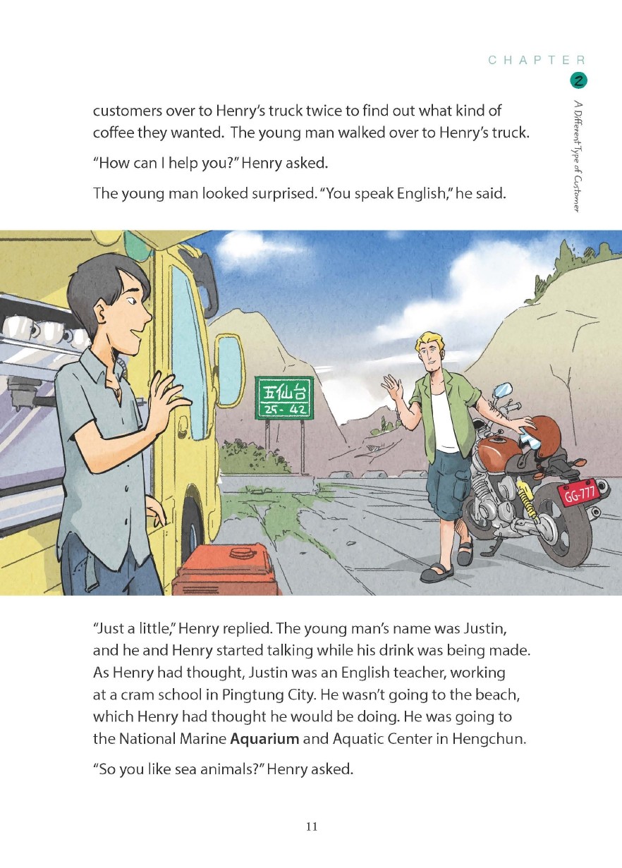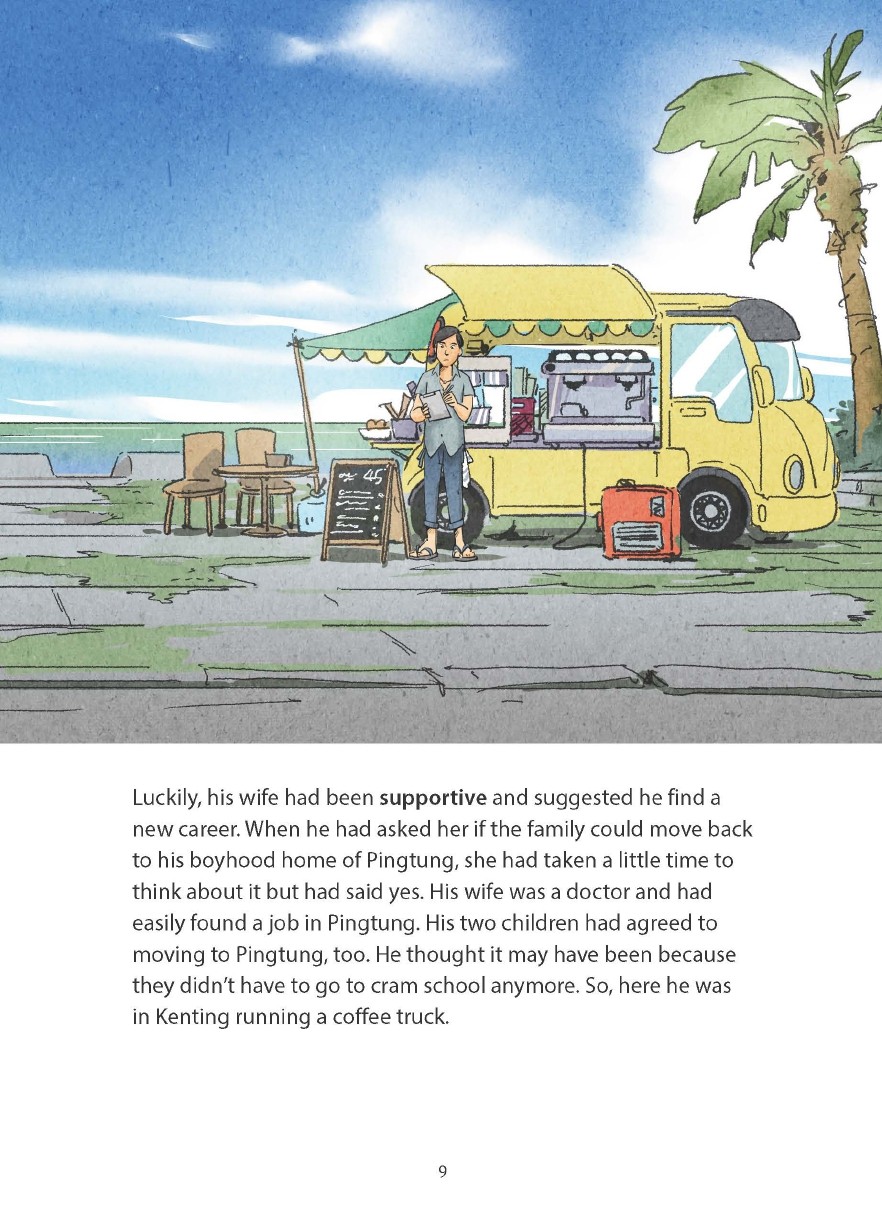 Many people want to be independent and run their own business. A popular choice in Taiwan is to open a coffee shop. In this story, Henry Chuang tries to turn his coffee truck into a successful business while trying to balance his family life. The reader will be introduced to Henry and his family, as well as the people who also sell coffee in Kenting—some of them friends and others business rivals. Henry is faced with needing to ask for help to save a baby whale he finds washed up on the beach. Henry learns that strangers can become friends and that help can come from unexpected places.