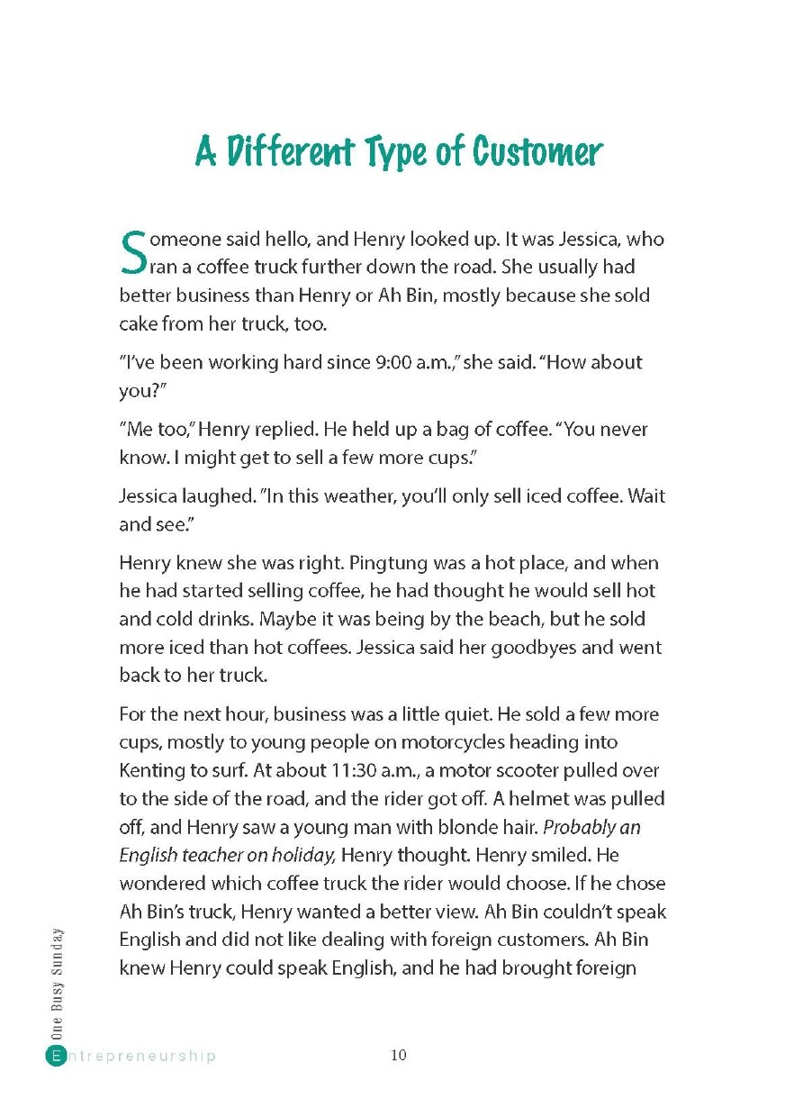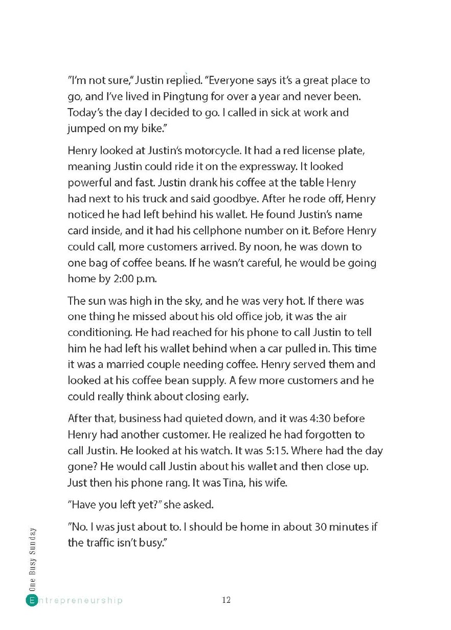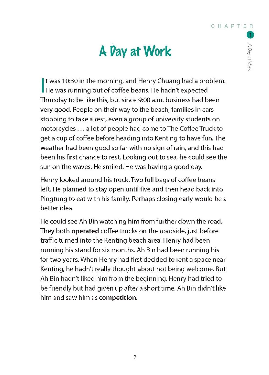 Many people want to be independent and run their own business. A popular choice in Taiwan is to open a coffee shop. In this story, Henry Chuang tries to turn his coffee truck into a successful business while trying to balance his family life. The reader will be introduced to Henry and his family, as well as the people who also sell coffee in Kenting—some of them friends and others business rivals. Henry is faced with needing to ask for help to save a baby whale he finds washed up on the beach. Henry learns that strangers can become friends and that help can come from unexpected places.