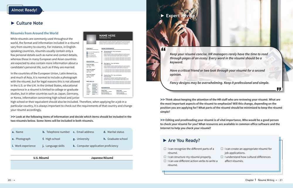 IntroductionReady for Work has been designed to help pre-intermediate level students prepare for careers in the workplace today. It is based on the authors’ original teaching materials that have been used in actual classrooms extensively with proven success for many years. It encompasses the prerequisite skills that students need for professional situations, including resume and cover letter writing, job interviews, email writing, and presentations.