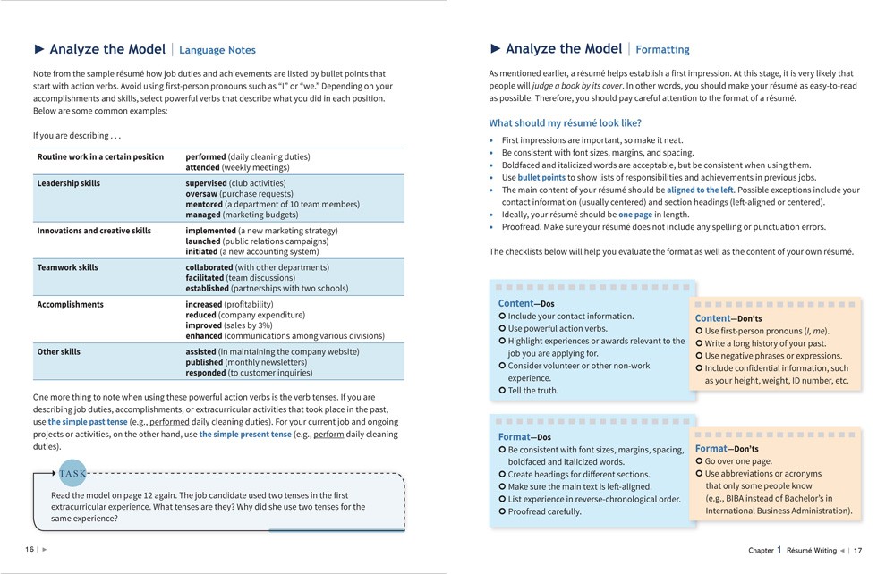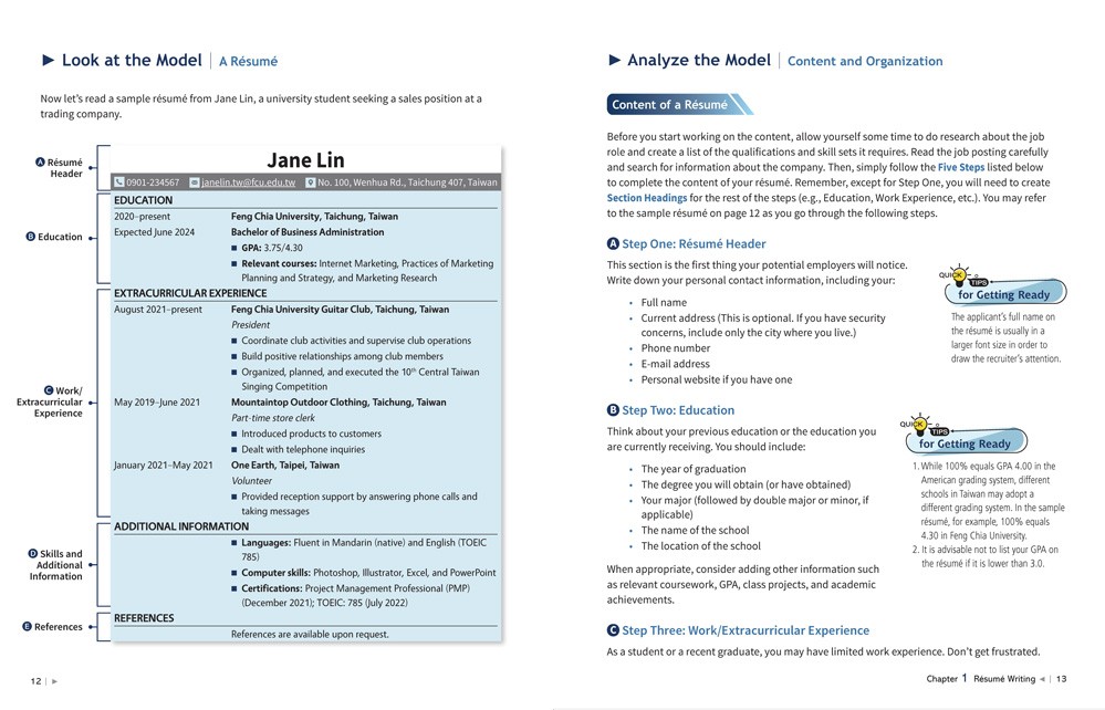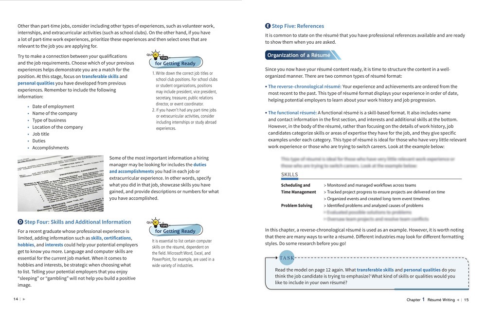 Ready for Work offers essential background knowledge, skills, functional language, and models with tasks and hands-on exercises for students. It utilizes a step-by-step approach. Each chapter starts with an opener presenting the objectives of the chapter and “bite-sized” warm-up activities to prepare students for the chapter. This is then followed by a reading passage and models where students will be guided to explore and analyze the models. Towards the end of each chapter, students will work on hands-on activities using what they have learned in the chapter.