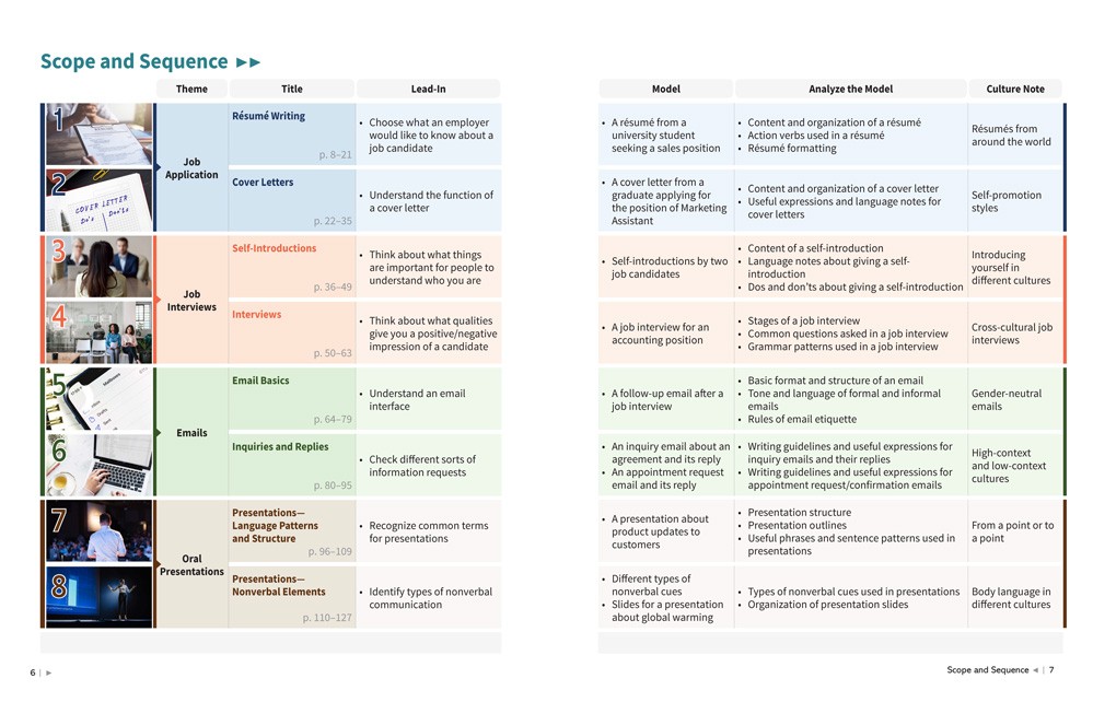 Since effective communication requires more than just language proficiency and skills, each chapter includes a Culture Note to develop students’ understanding of a particular aspect of cultural differences. Additionally, the Expert Advice section aims to provide students with more tips and advice which they can consider in the given professional situation.