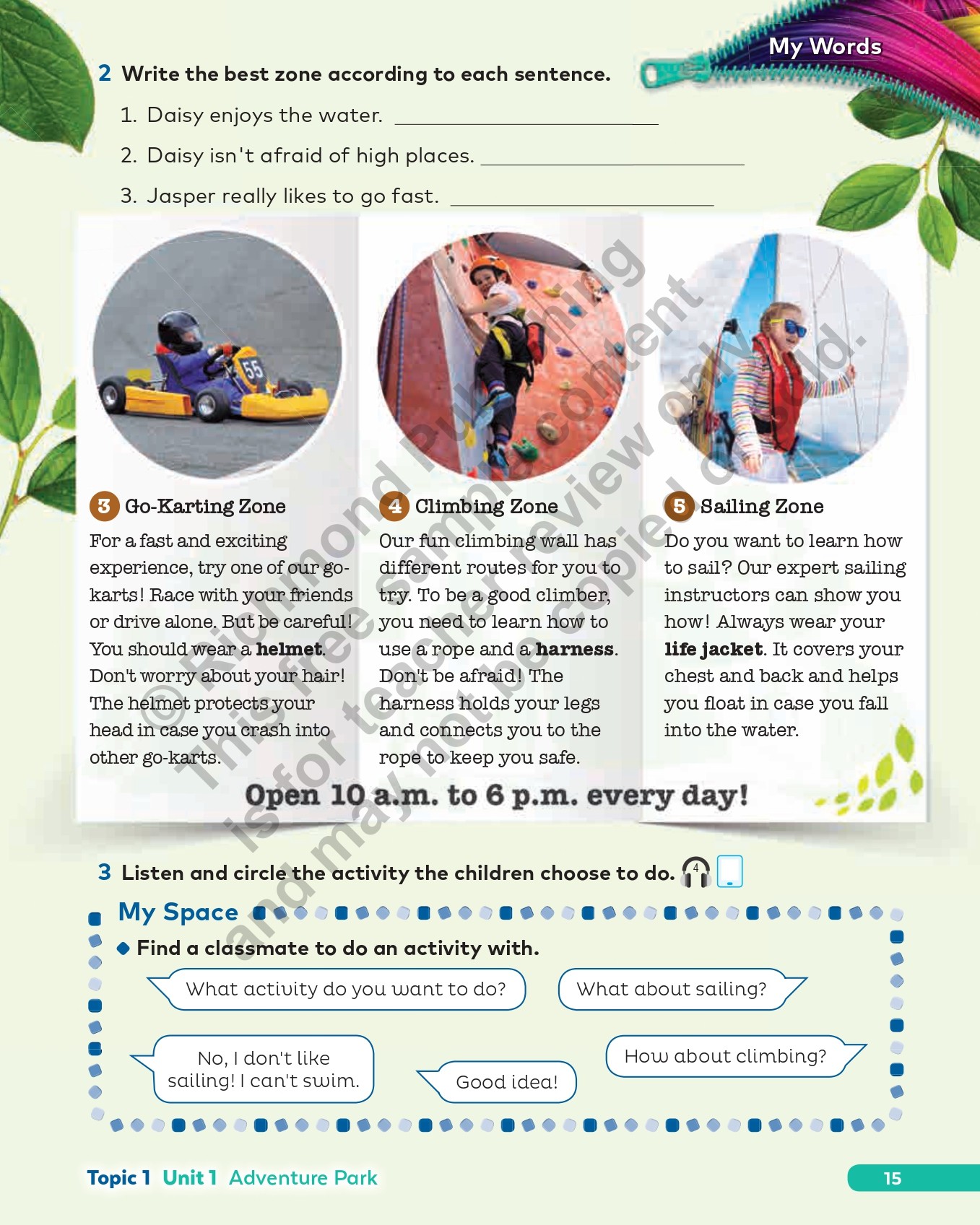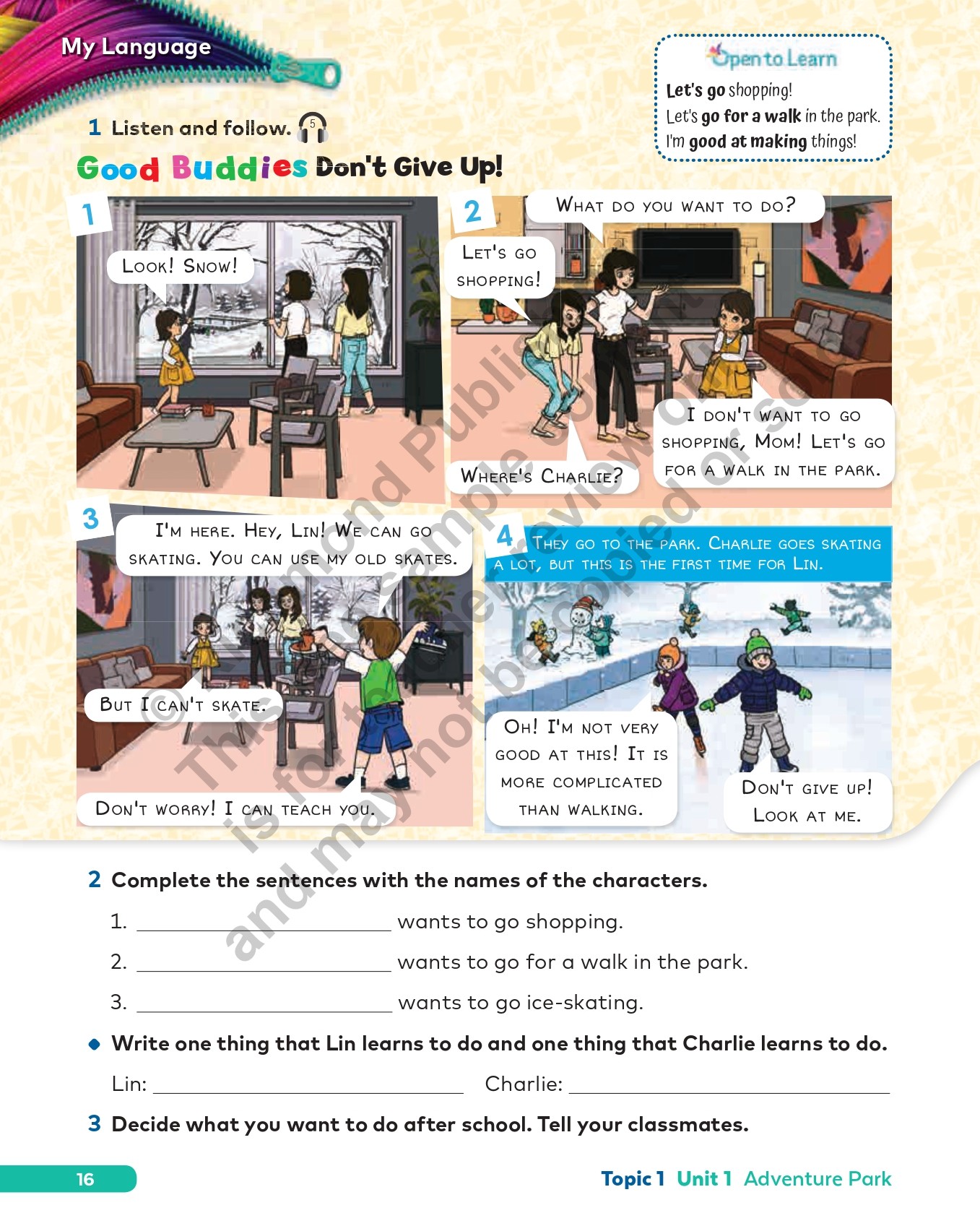 Every Student’s Book opens another world – and another endangered species and its habitat! A Welcome Unit introduces each level, recycling earlier content (Level 1 opens with functional classroom language). Then two complementary units develop a topic (four per level), meaning topics include an integrated Mindfulness program, Citizenship, CLIL, project work, international exam preparation, and the Good Buddies story with its threatened animal, as well as the essential vocabulary, skills, grammar and phonics practice! Students self-evaluate at the end of each topic and complete a fun home connection task.