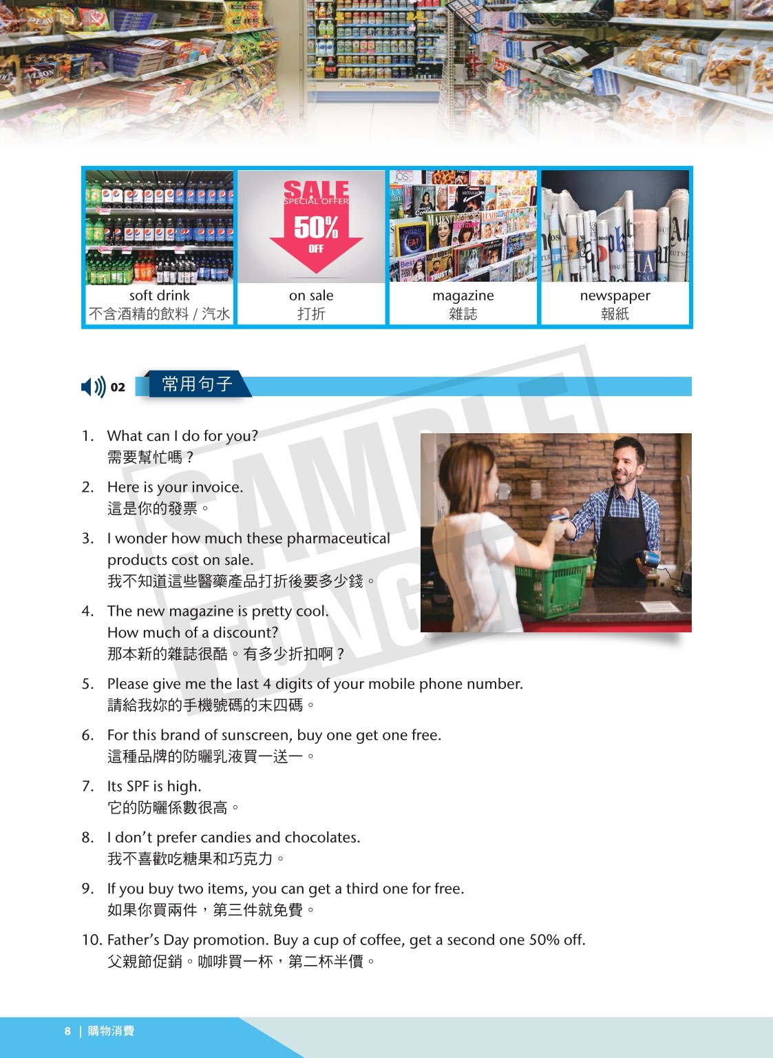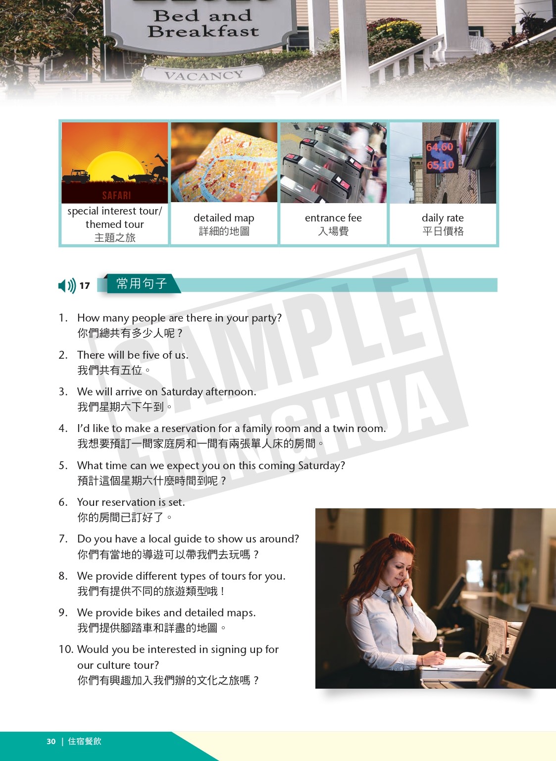 隨著服務業國際化,商務旅遊及觀光來台人士持續成長,英語能力對商務服務職場的需求日趨重要。『職場有聲英語手冊』應運而生,本書共分5大類別,總計21章, 內容涵蓋外籍觀光商務人士於購物消費、住宿餐飲、觀光遊憩、醫療服務,與交通運輸等場合經常遇到之情境,編寫常用語彙、句型及實用對話,並搭配英語專業人士實境錄音,提供使用者系統性的學習。也希望透過本書,幫助莘莘學子,進入職場前能夠流暢使用服務職場英語,提升個人英語能力,以備未來求職之需。