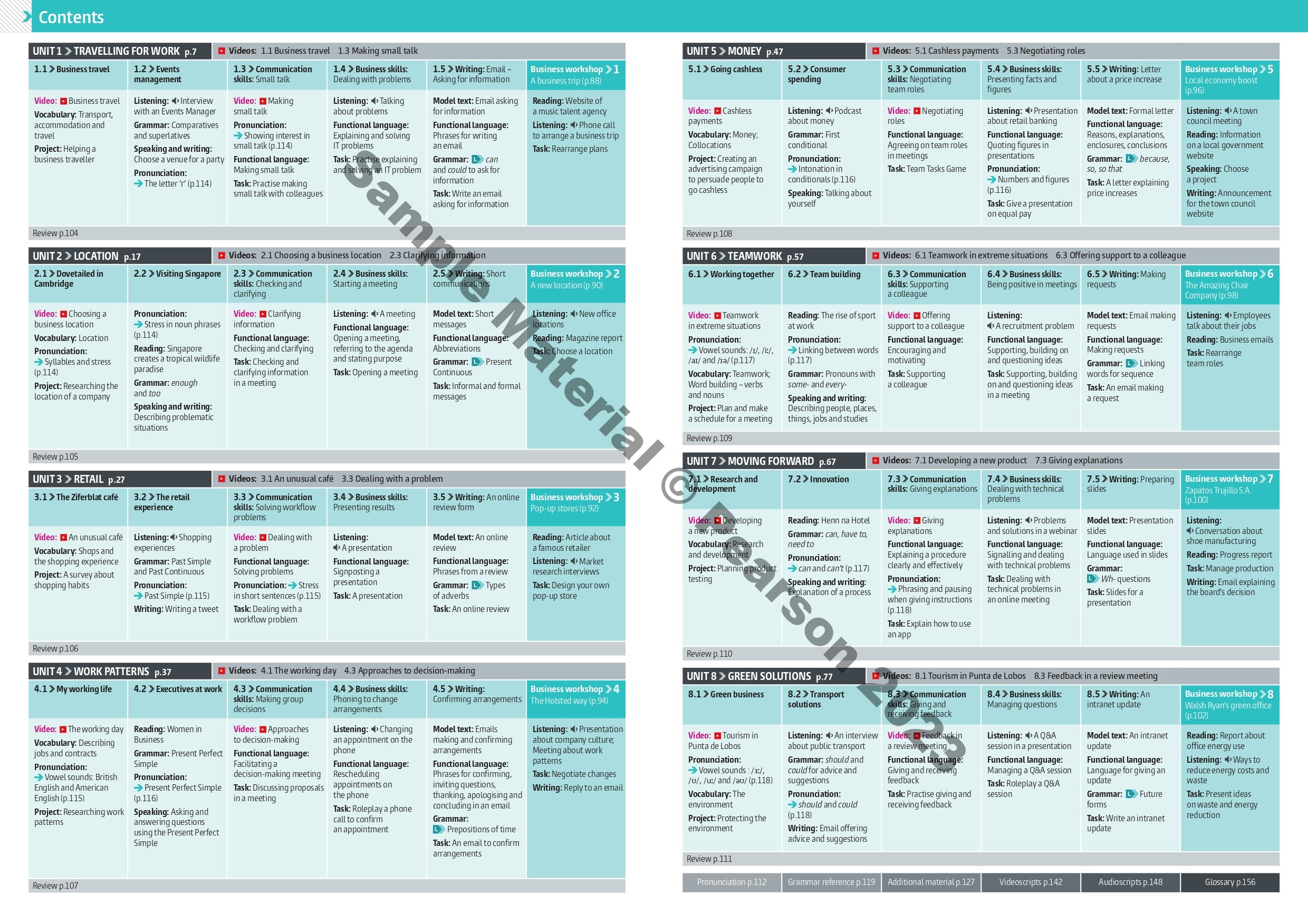 - A Reading bank with additional reading texts and activities, a Writing bank with supplementary models of professional communication, and a Functional language bank with useful phrases for a range of business situations such as presentations meetings and interviews.