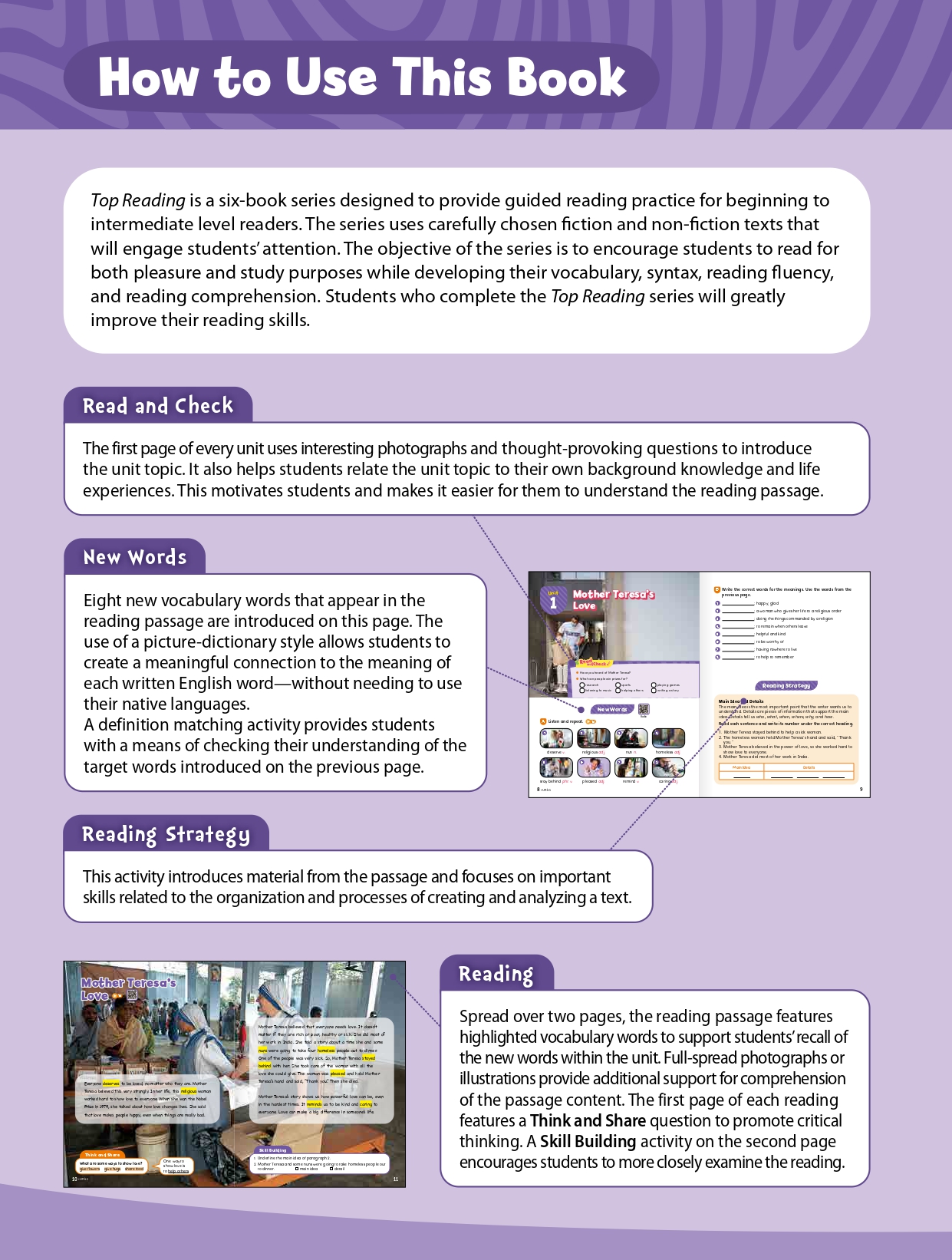 Top Reading SeriesTop Reading is a six-level reading program that helps young English learners build confidence, fluency, and essential reading skills. Through short, engaging passages and age-appropriate topics, students develop vocabulary, comprehension, and a positive reading habit. Designed for EFL/ESL environments, the series supports steady language growth from beginner to low-intermediate levels (CEFR Pre-A1 to A2+).