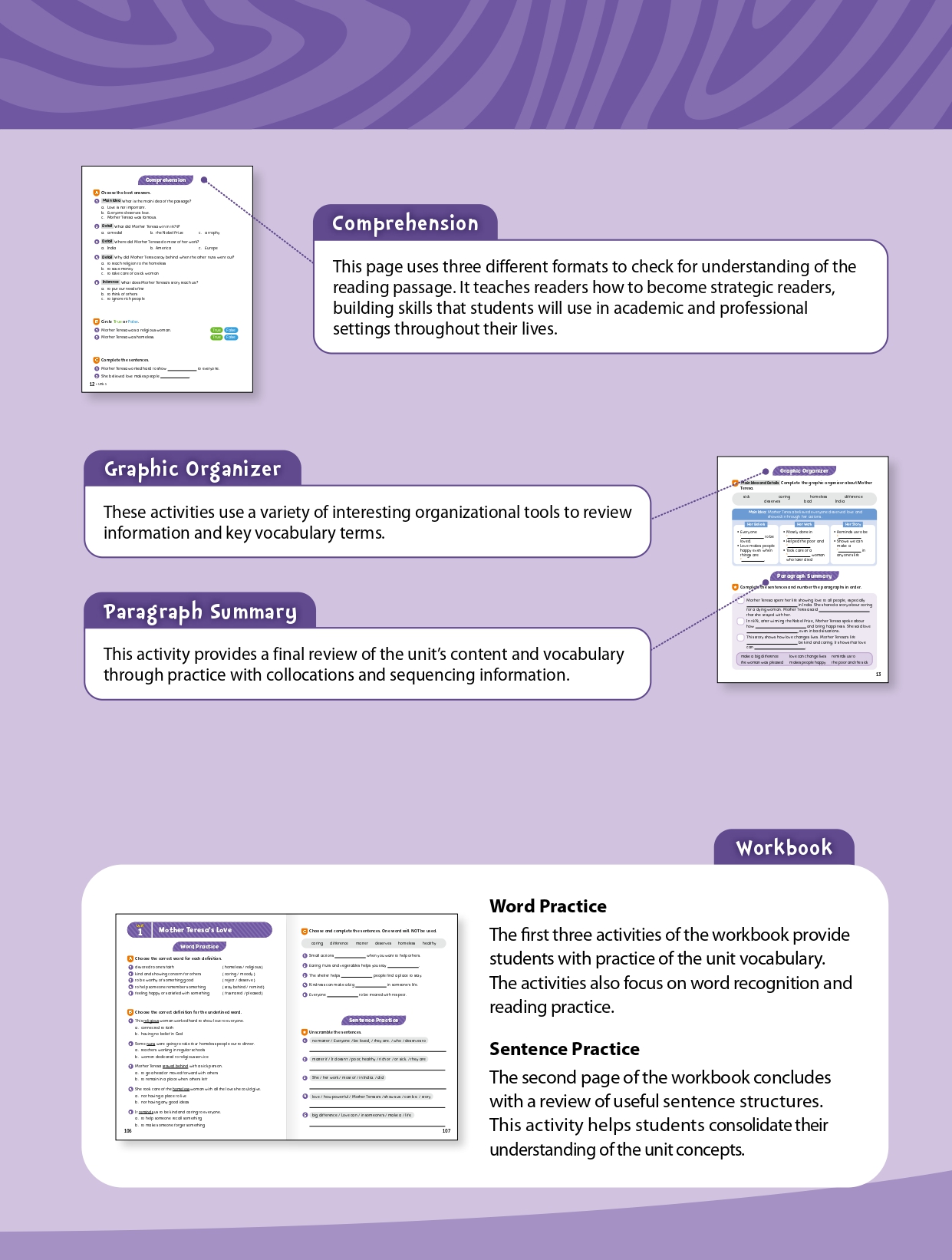 - 第 5–6 冊: 發展高階理解與學術閱讀技巧,包含個人反思 (Think and Share)、理解力檢測 (Skill Building)、閱讀策略 (Reading Strategy)、學術詞彙發展 (關鍵字定義)、進階圖表組織及架構式摘要(第 5 冊的單段摘要與第 6 冊的分段摘要)。