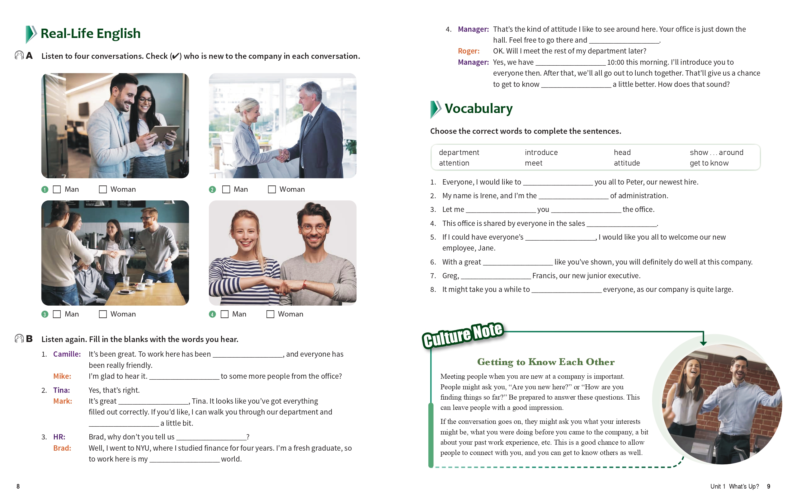 - Dialogue Practice includes short dialogues in different settings and situations presented for students to practice.