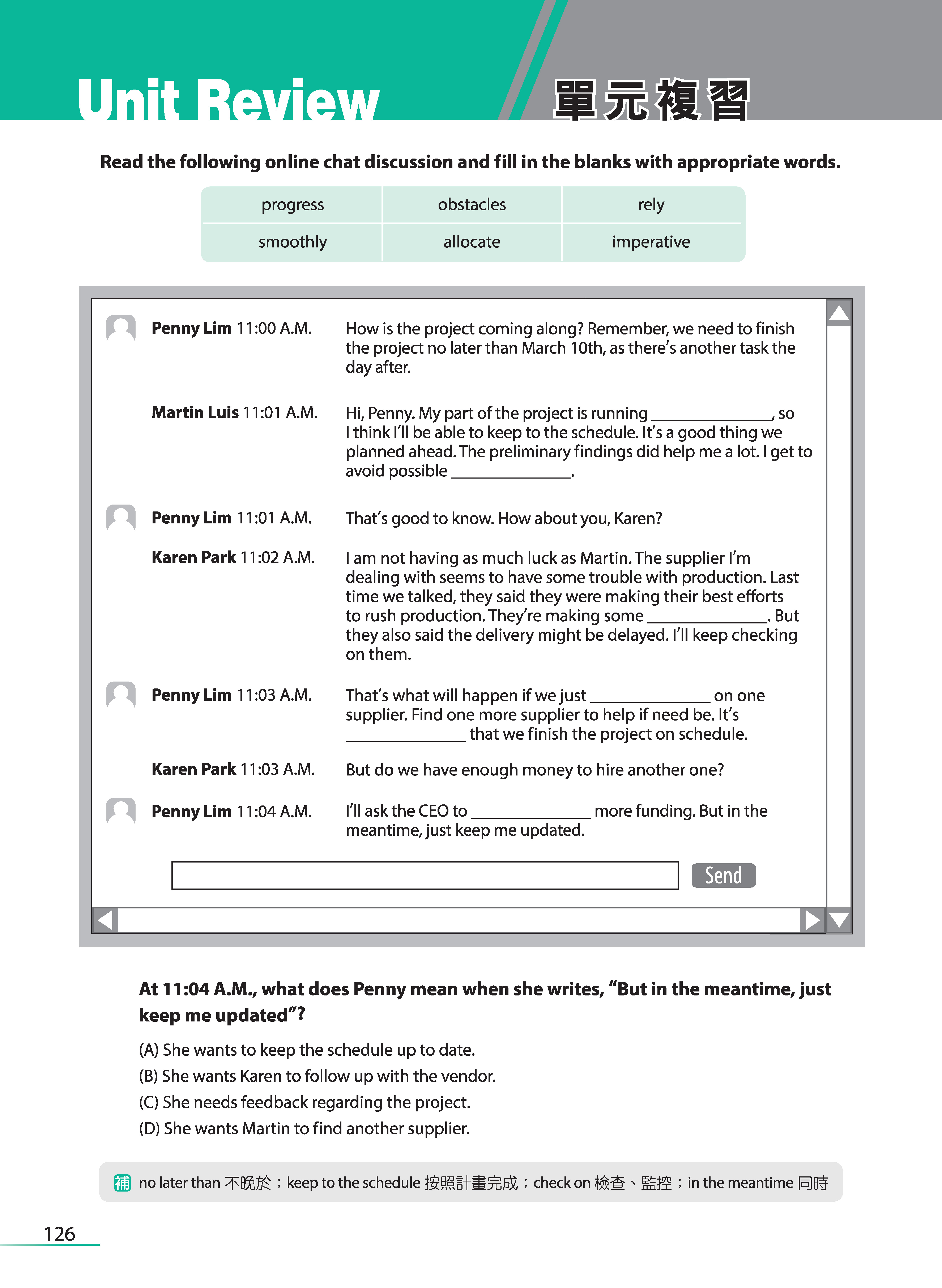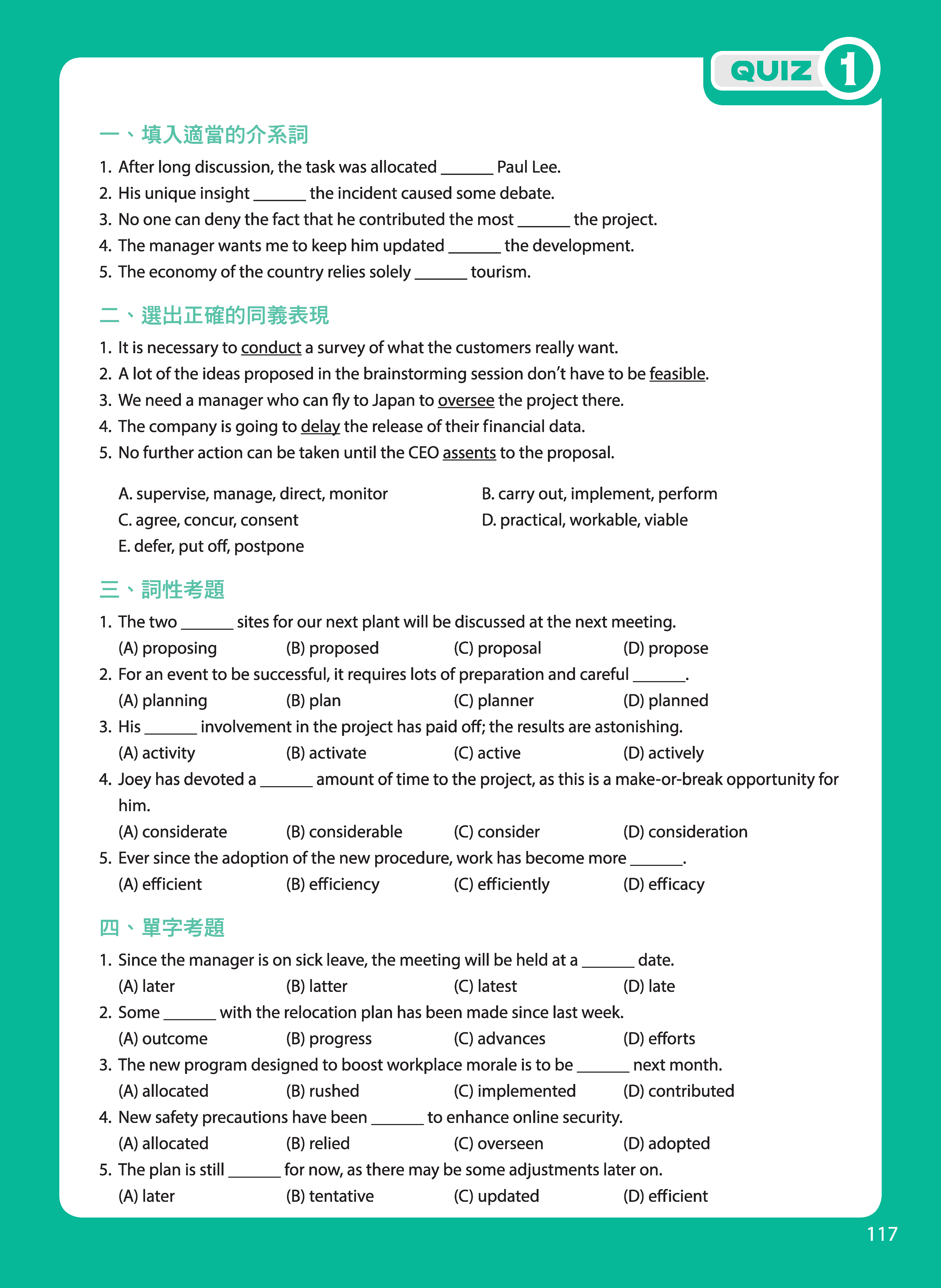 再者,我覺得一本有效的多益單字書,除了提供例句和整理考試的重點之外,大量的練習也是很必要的,所以當初花了很多時間,針對每個單元的必學單字和追分單字,都編寫了份量一樣多的練習題,不但能方便檢視自己的學習成果,也能做為考前衝刺的重點提要整理。