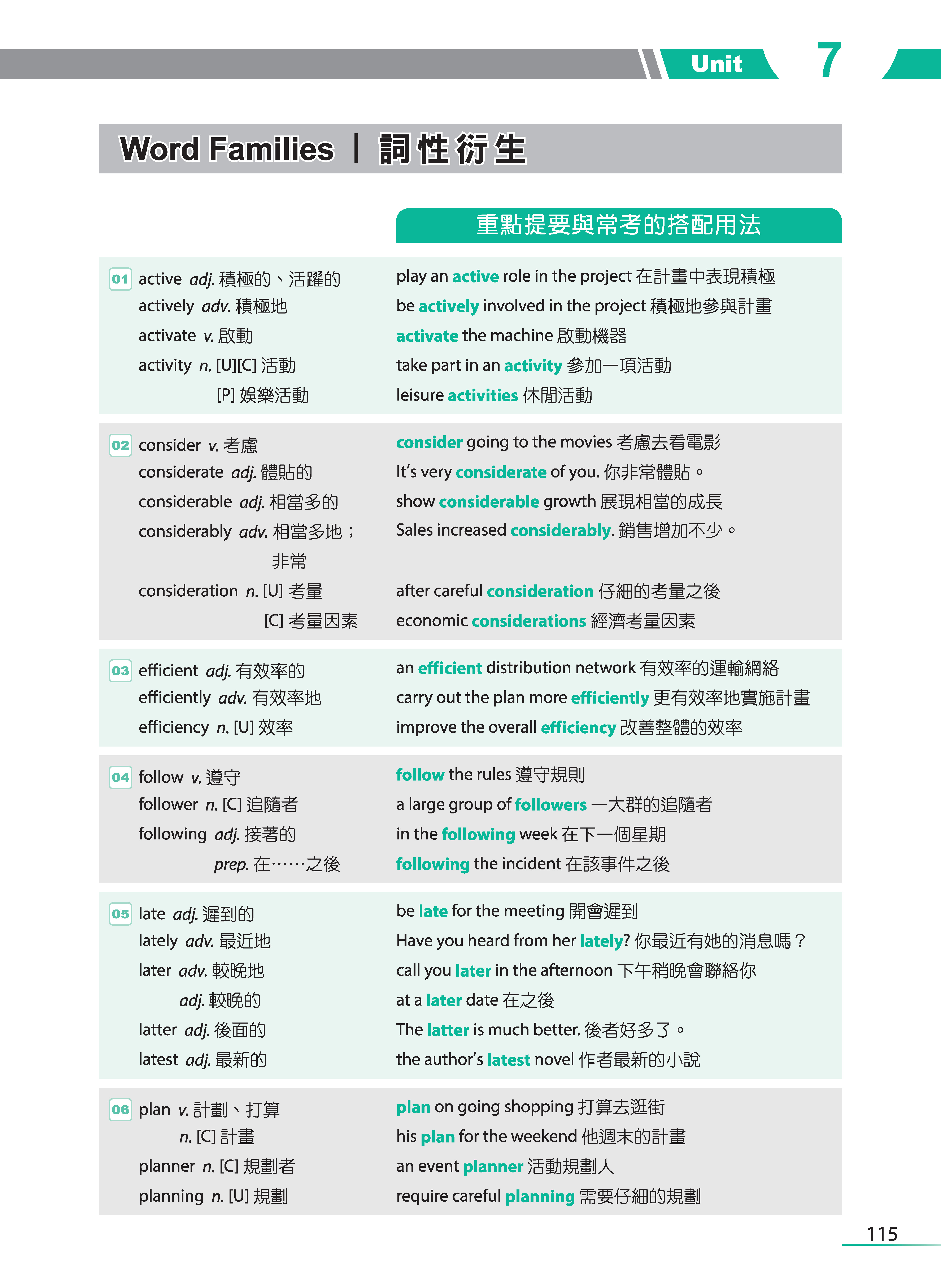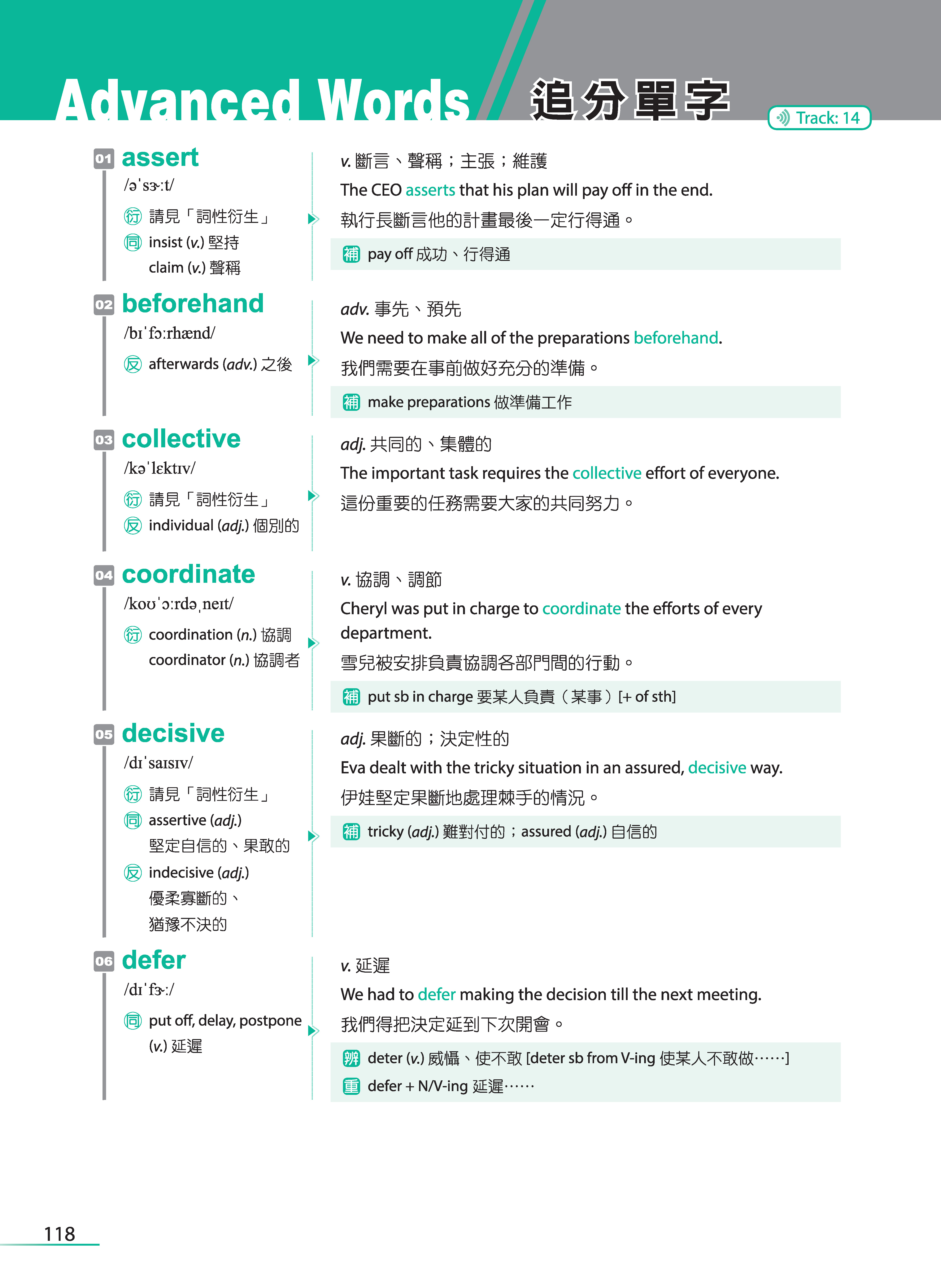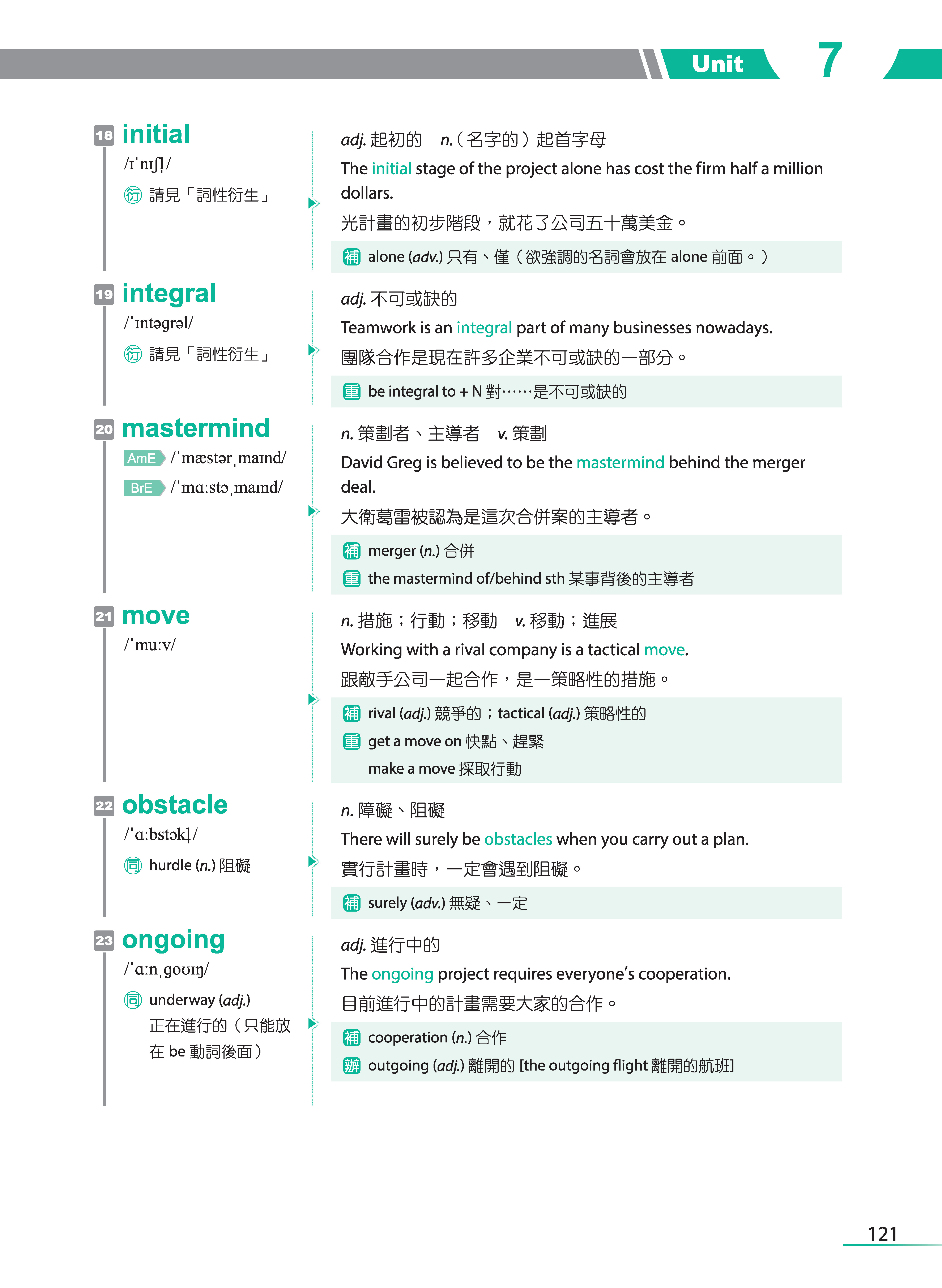 只是,背單字對很多人而言,真的是很痛苦的一件事,這點我比較承認。但不管學什麼語言,包含自己的母語,單字量的累積其實是必經的過程,具備了基本的詞彙量之後,才能看得更多、學得更多,而這也是我在規劃這本單字書的架構時,所抱持的想法。希望初、中階的學習者能將每個單元的必學單字都掌握了之後,再學習追分單字的部分;而高階的學習者可從追分單字的部分著手,知道自己還有哪些單字是不懂的。