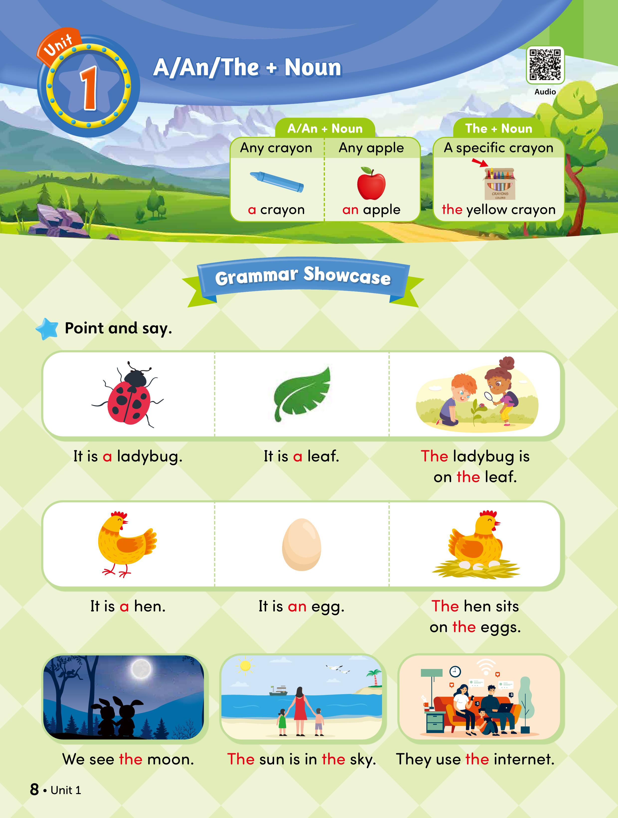 • Level 1-3: Instead of presenting rules first, learners infer grammar patterns by observing illustrations and visual cues. Learners internalize grammar by moving from meaning-focused input to form-focused practice and guided output.