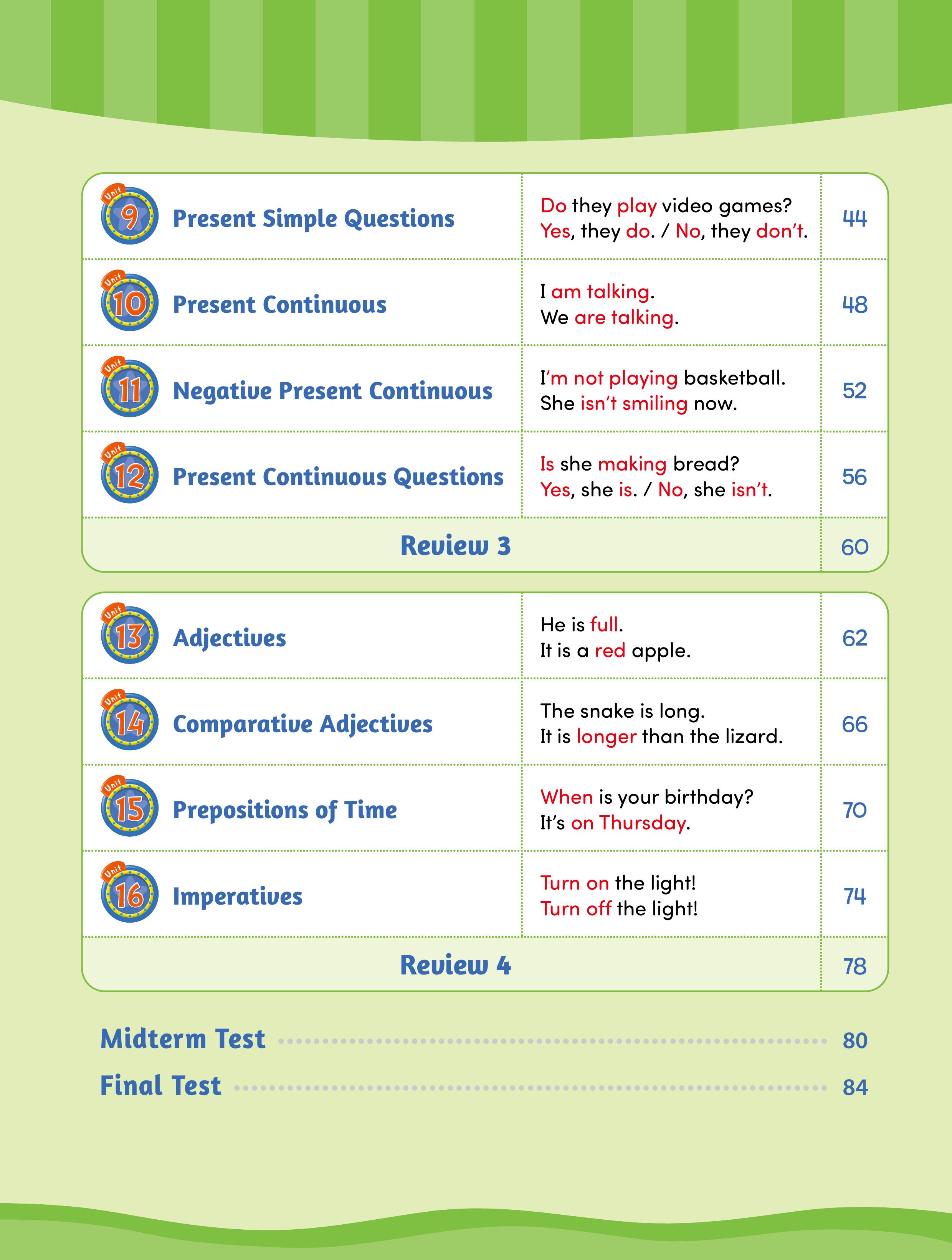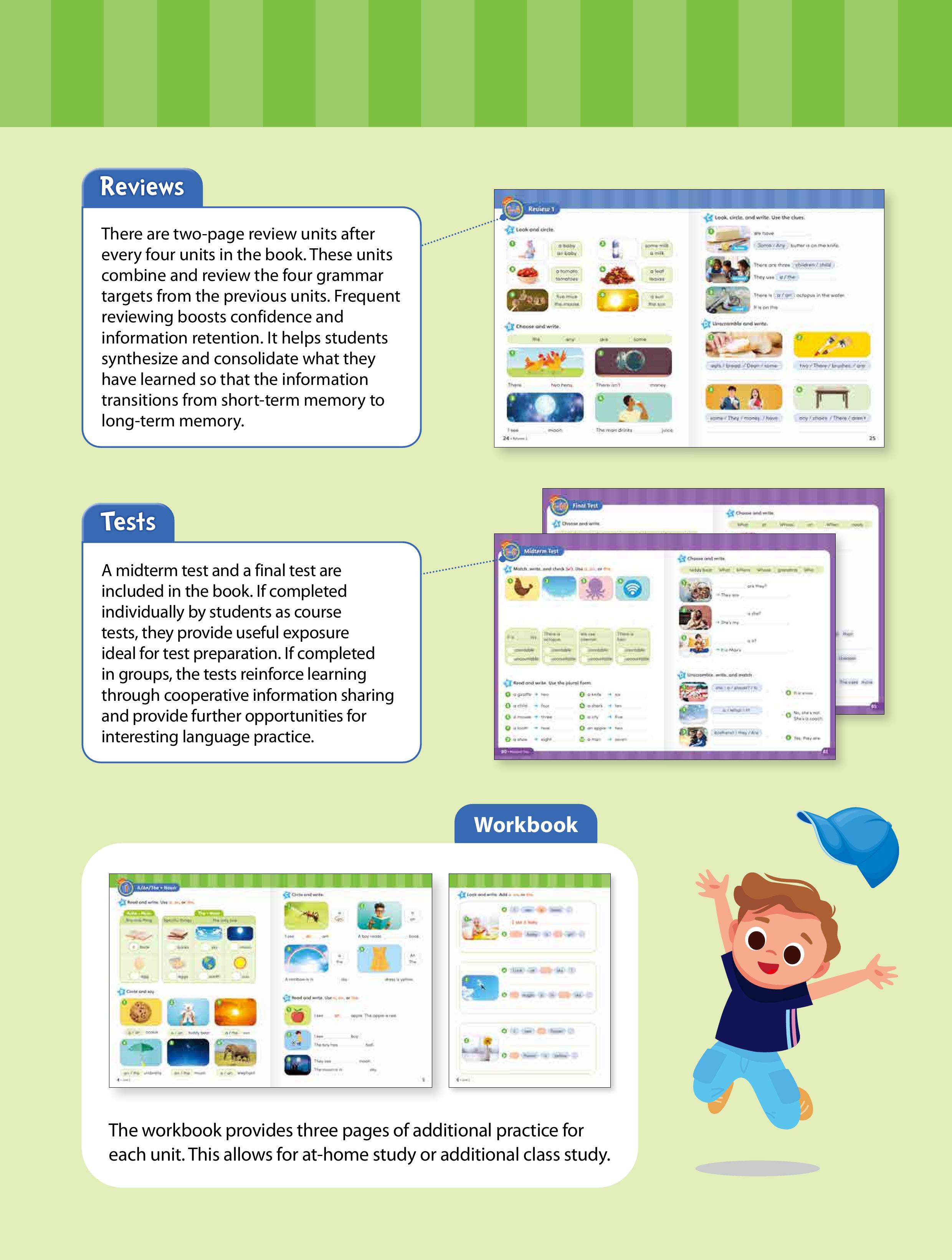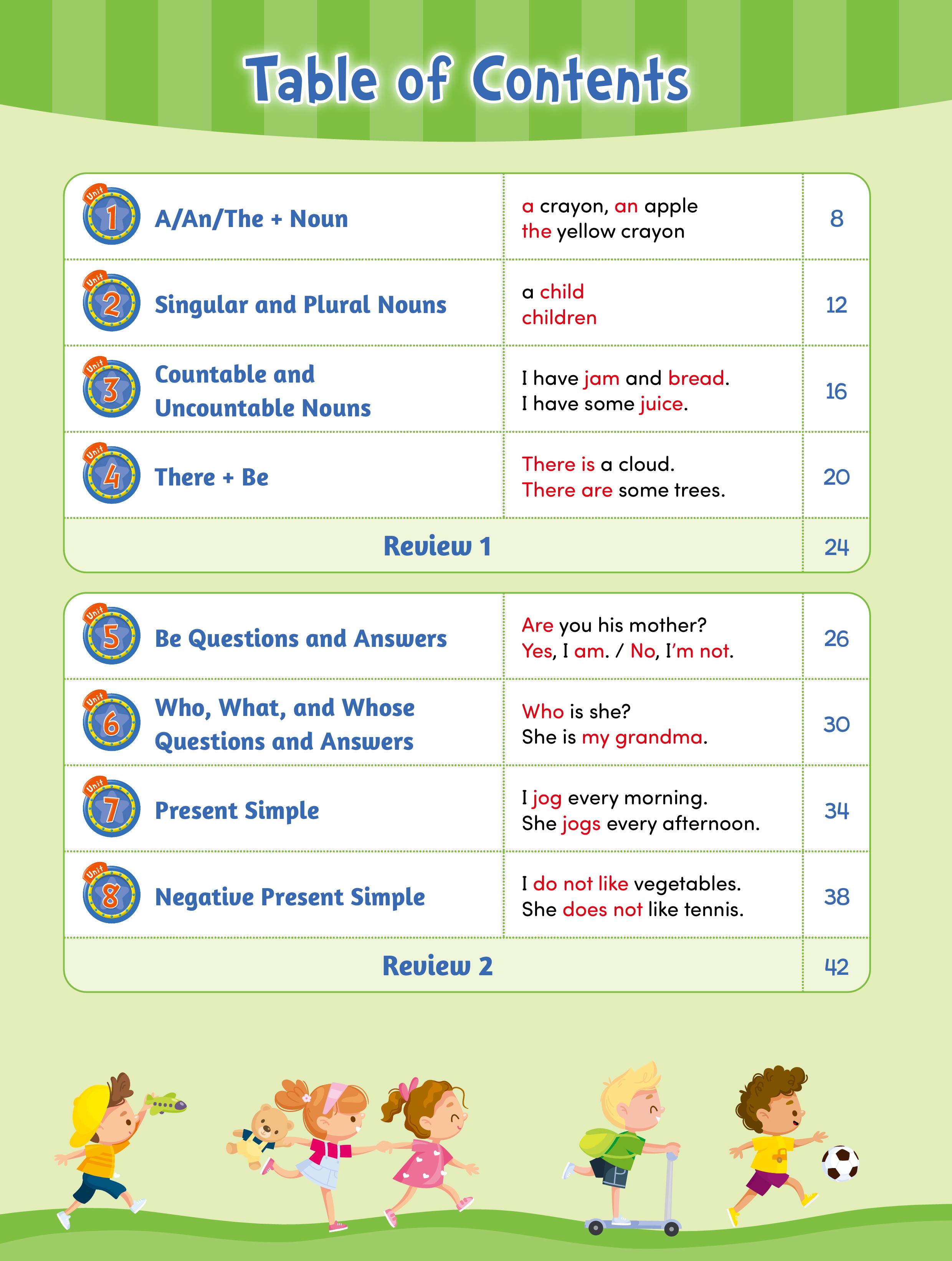 • 第 4-6 冊: 透過簡潔的視覺範例與範文,引導學生接觸文法結構,再以圖表與清晰解說,幫助學生全面理解每個概念。
